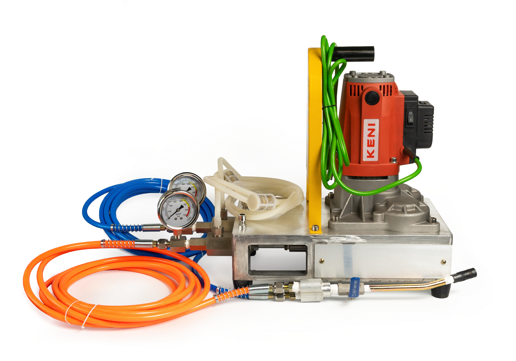 Поршневой электрический насос GK-32 предназначен для инъектирования низковязких акрилатных гелей в строительную конструкцию в процессе устройства инъекционной гидроизоляции и восстановления герметичности трещин и швов. Поршневая группа и все комплектующие, имеющие контакт c материалом, выполнены из металла, не подверженного коррозии. Забор материала осуществляется непосредственно из тары через всасывающие шланги. Смешивание компонентов происходит в насадке-смесителе, что позволяет использовать насос для инъектирования материалов с малым временем реакции.